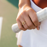 Crisp lines and perfectly proportioned curves dance around the Paume Racquet frame to create the beautiful fluidity of the Classic Ring.